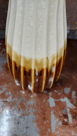 Midcentury Cream Brown Drip Glazed Ribbed Earthy Studio Pottery Vase