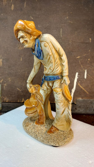 Midcentury Saddle Tramp Cowboy Ceramic Figurine - Rustic Folk art Style Hand Painted with textured sand base