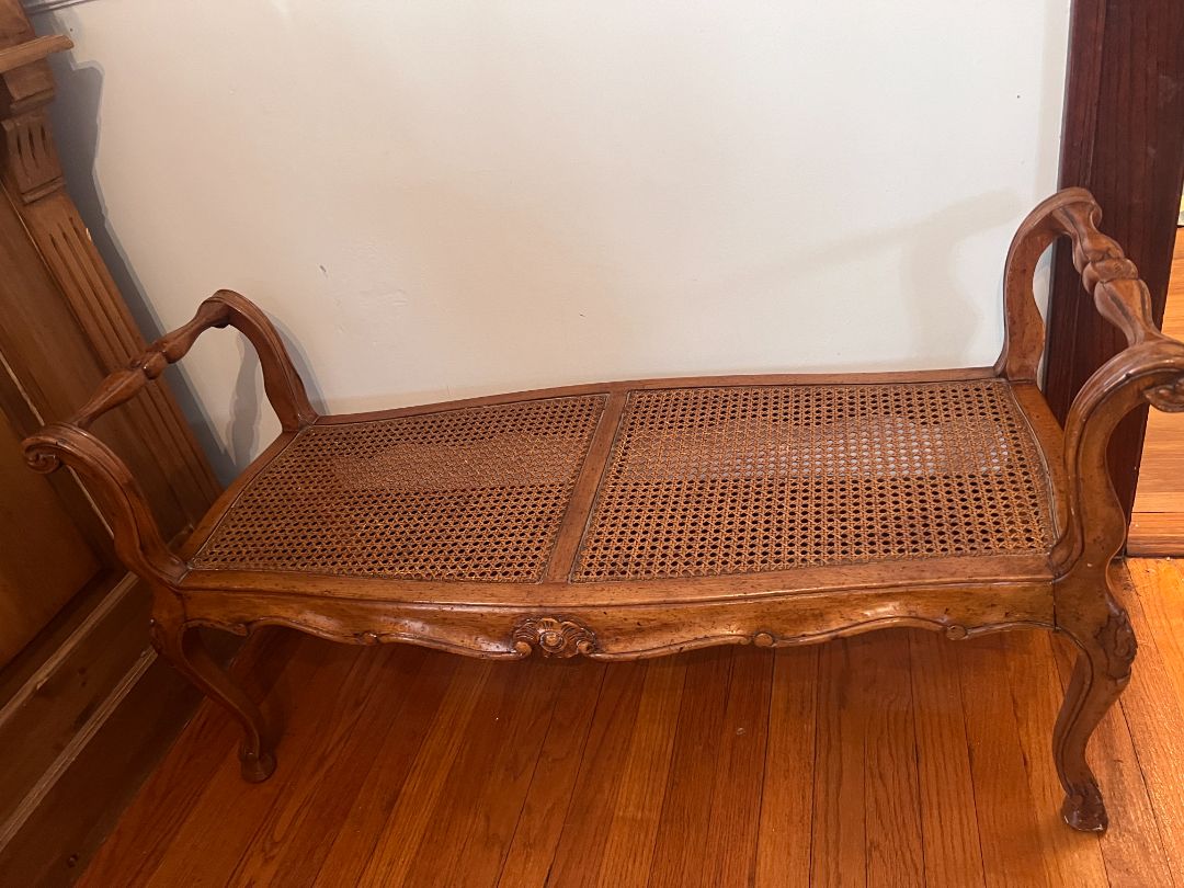 bench1950s French Country style carved wood and cane benchh with rolled arms. Comes with a cushion. 42"lX14"H