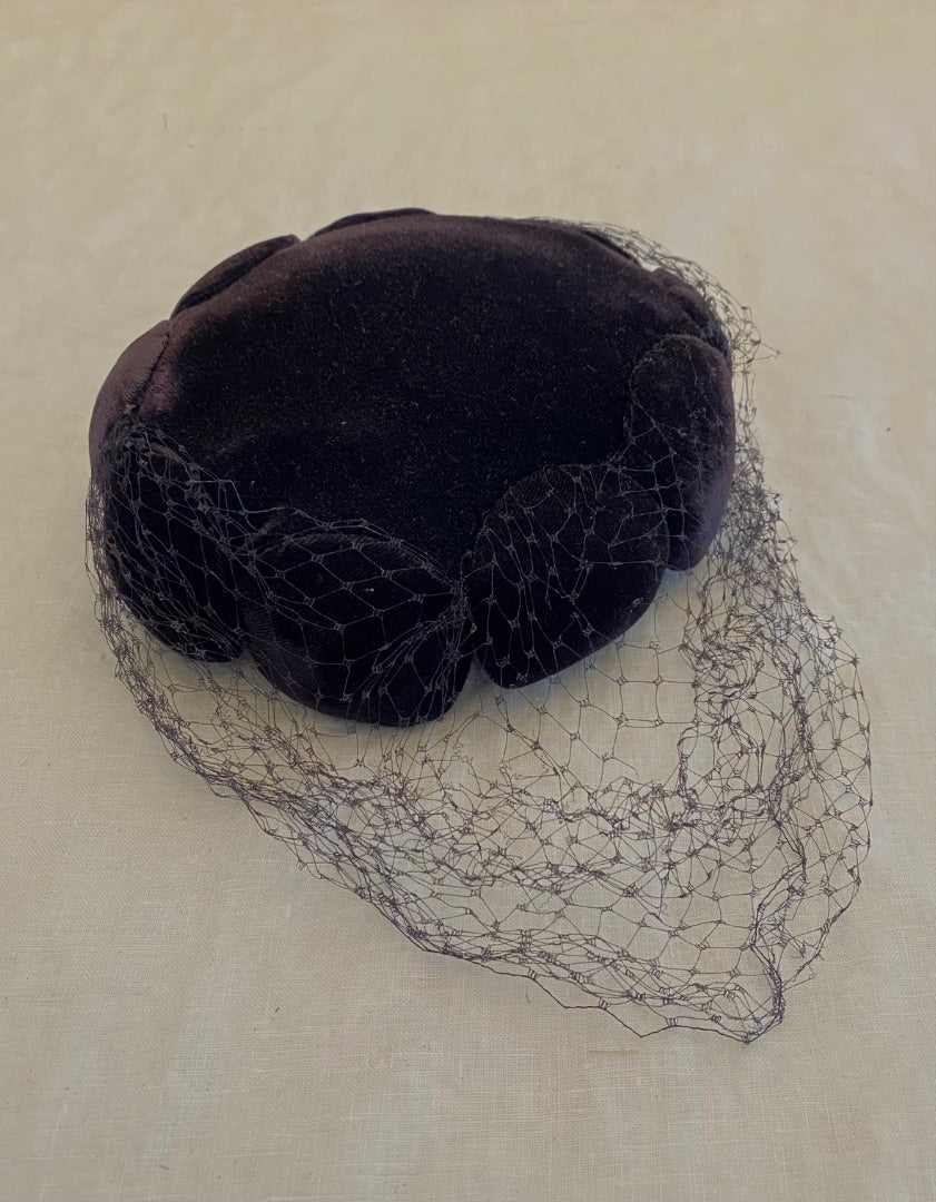 Vintage velvet fascinator hat with mesh veil AS IS with some damage to mesh veil