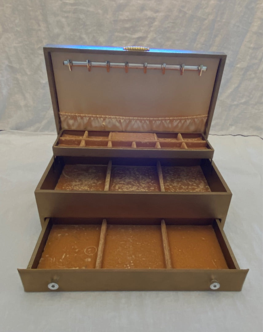 Vintage wooden gold painted jewelry box with flip open display lid and drawer AS IS with scuffs on paint and wear to velvet linings