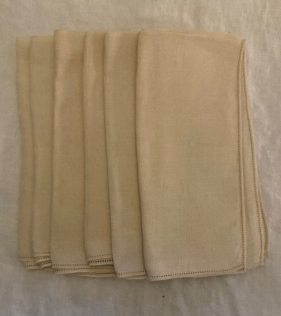 Vintage linen napkins with embroidered cut work edging (set of 6) AS IS with 1 napkin with spots 16”x16.5”