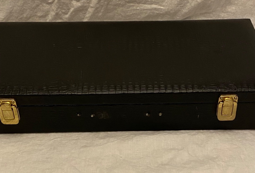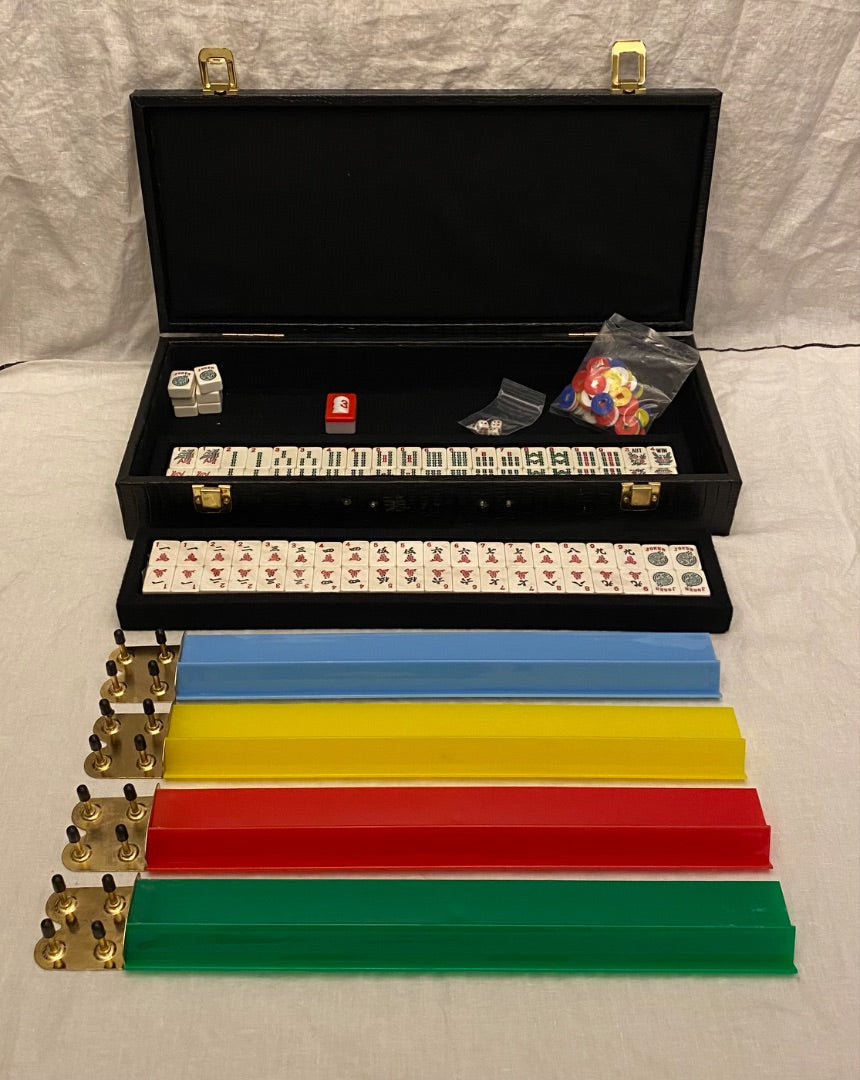 Vintage Mahjong set with tiles still sealed in original packaging in AS IS case with missing handle and tear In vinyl case as shown.