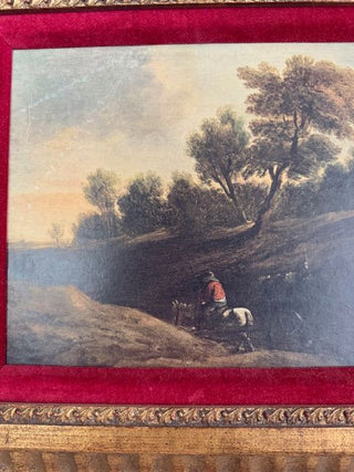 European Pastoral Landscape Reproduction Print in Ornate Frame w/ Red Velvet Border