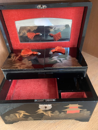 Vintage M&M Japan Musical Black Lacquer Jewelry Box 8.5 inches x 6 inches x 5 inches high