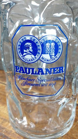 1970s Paulaner München 1 Liter Dimpled German Beer Stein - Maß (1 liter) traditional Masskrug style mug - festival breweriana. Blue And white logo.