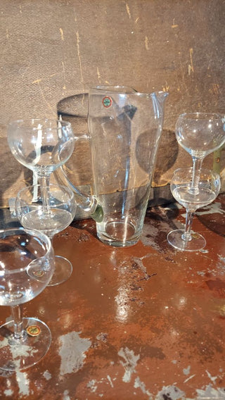 (7pc) 1960s Hand Blown Crystal Cocktail Serving Set Monterrey collection by Riekes-Crisa - 6 Coupes & One Handled Shaker Pitcher