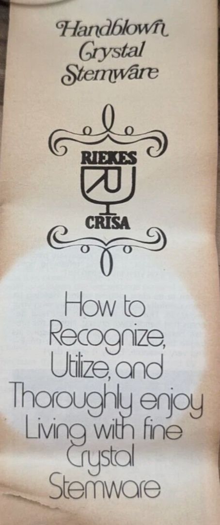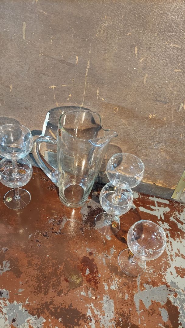 (7pc) 1960s Hand Blown Crystal Cocktail Serving Set Monterrey collection by Riekes-Crisa - 6 Coupes & One Handled Shaker Pitcher