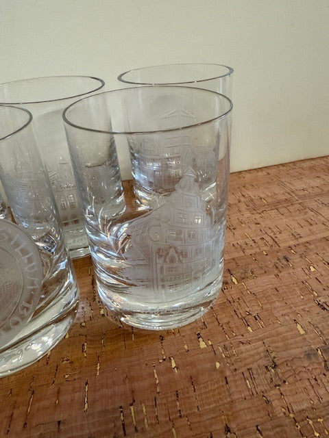 6 glasses with historice building (Nuremberg Germany) etched in glasses. Six different building on each glass. Signed on bottom