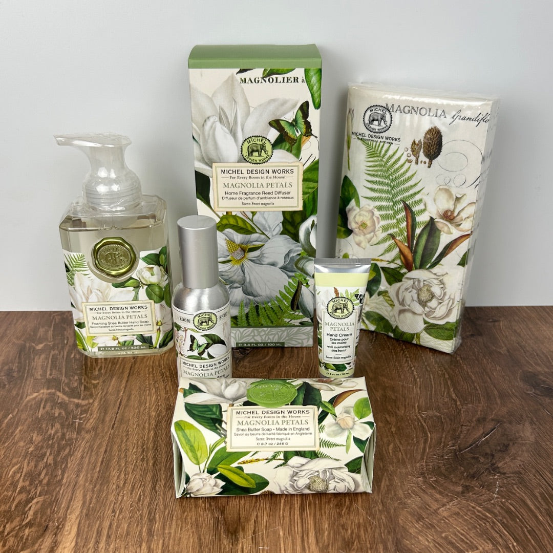 Magnolia and green leaves with notes of honeysuckle and citrus