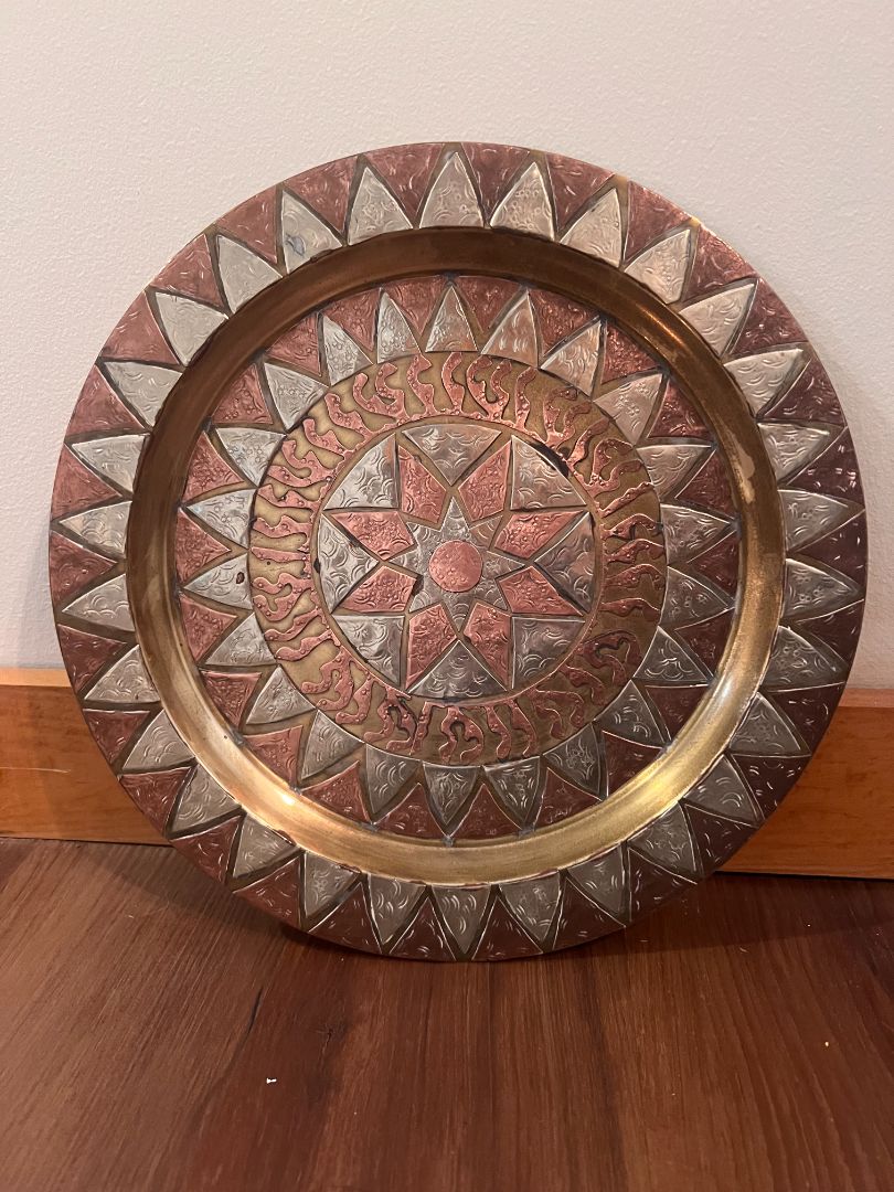 Antique mixed metal plate with starburst 13.5"x13.5".Moroccan metal work is a combination of copper and brass.