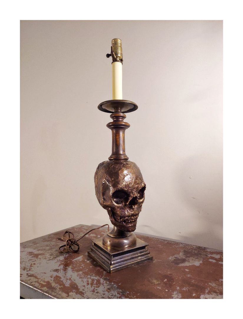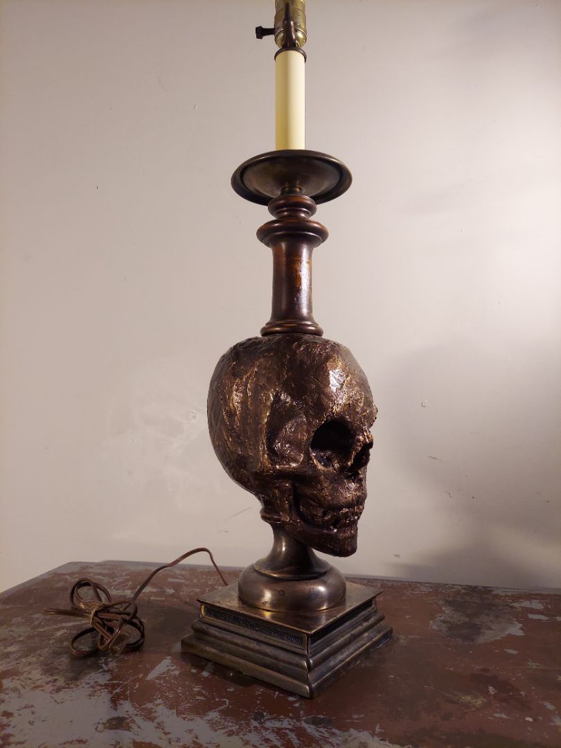 Artist Original Bronze tone rustic Human Skull Candle Stick Table Lamp