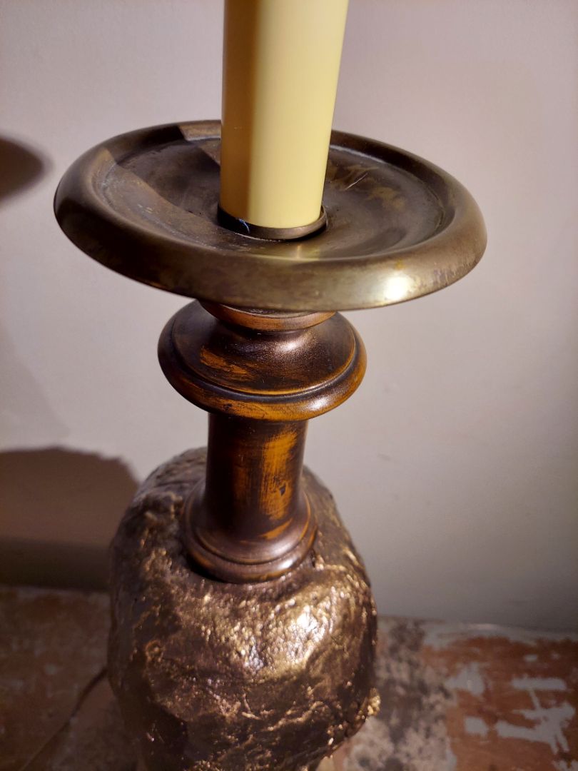 Artist Original life size human Skull Plaster Sculpted on a repurposed Mid-century brass, wood and copper table lamp, as a small "candle wax" Brass catch shelf at top.