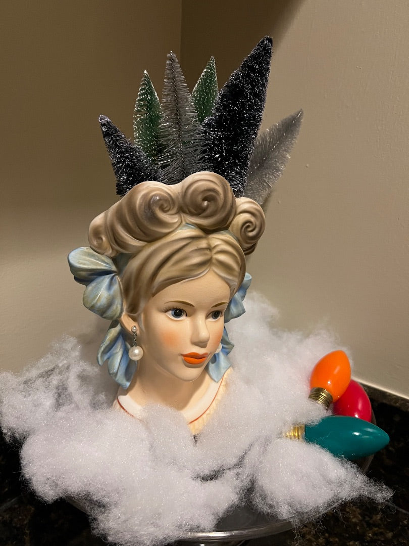 Extremely Rare Teen Head Vase with Blue Bow - 7" Enesco