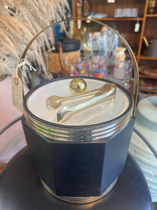 Vintage, 1960 black vinyl &gild delist ice bucket with tongs