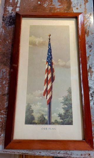 "Our Flag” by Fred Tripp, 1940s framed original lithograph art print by McCleary Hospital in Excelsior Springs, Missouri with story.