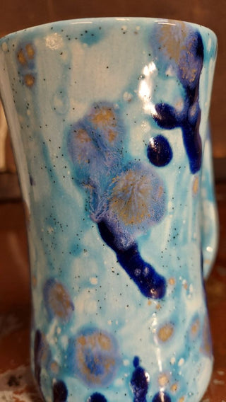 Studio Art Artisan Handled Mug, featuring speckled and drip glaze, blues and white ceramic piece (As-Is)gold