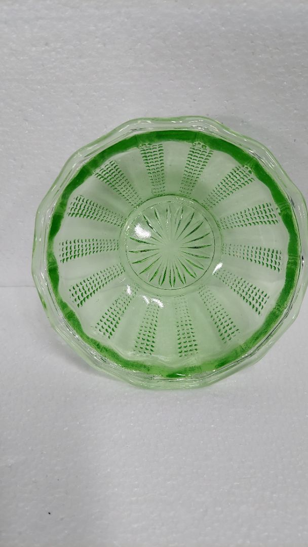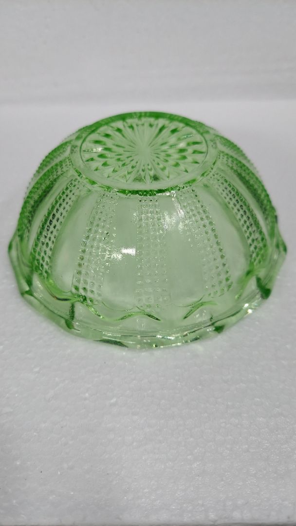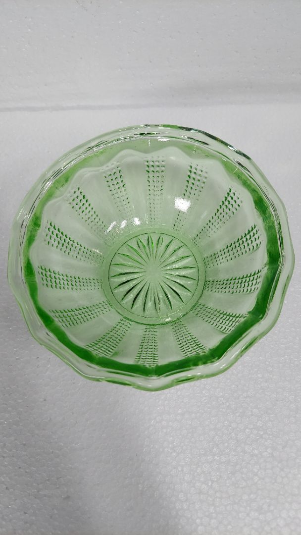 1890s Hand Blown Shaped - Green uranium glass ornate fruit sorbet bowl (As-Is)