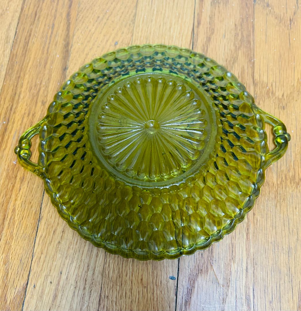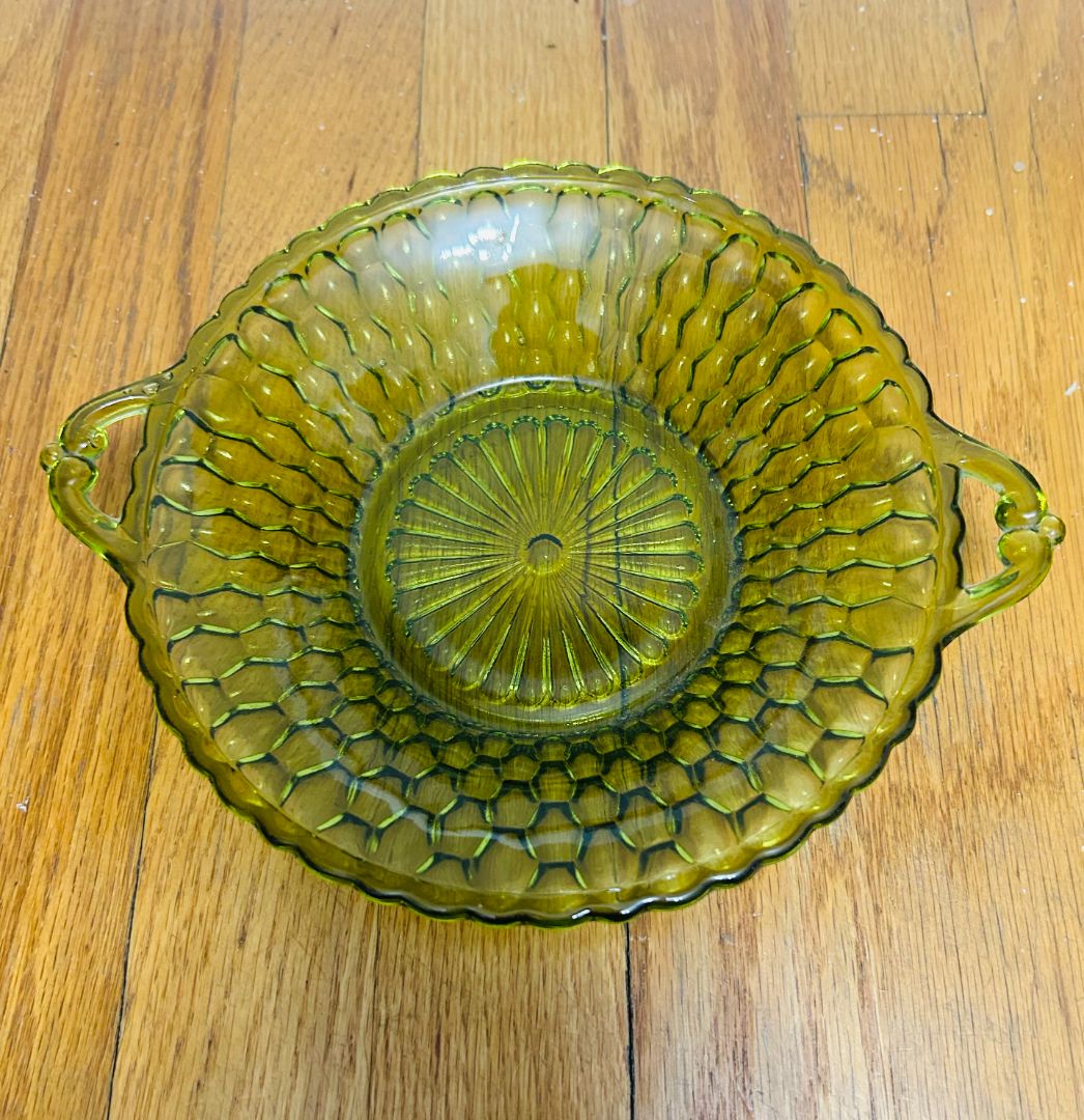 Vintage Avocado Green Bowl with handles - honeycomb pattern. Indiana Glass co produced circa 1960's.