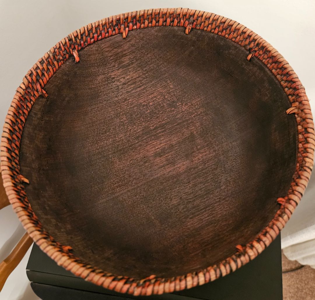 Vintage Handmade Wooden Bowl with Woven Rattan Rim