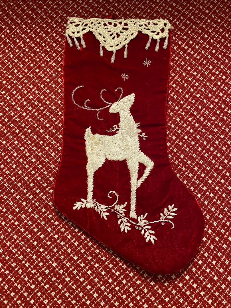Velvet Stocking w\Embroidered Reindeer Design-2003 Prima Creations Inc.