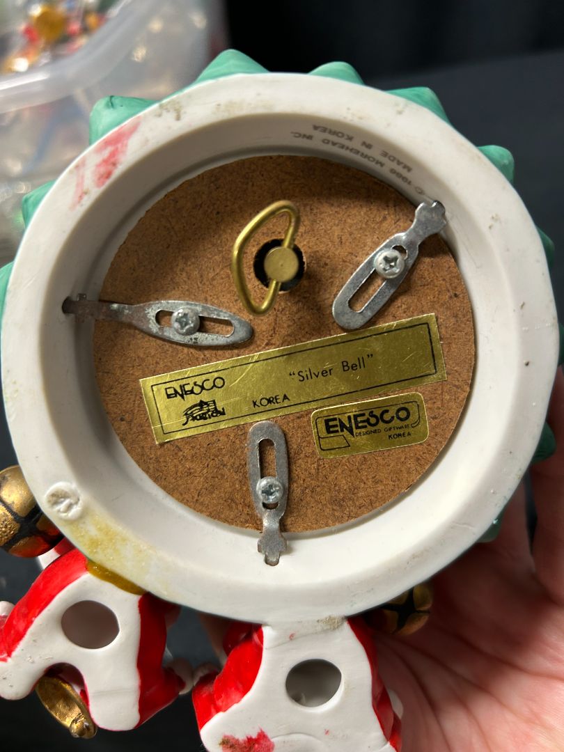 • Gently used wind-up music box from 1986 that plays "Silver Bell" and has darling details. Girl's left hand is chipped off.