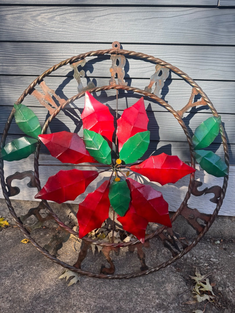 Vintage, metal wreath Poinsettia sign Merry Christmas