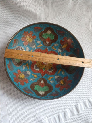 VINTAGE BRASS & ENAMEL BOWL Peacock & Flowers Made in India - Colorful 9.5"