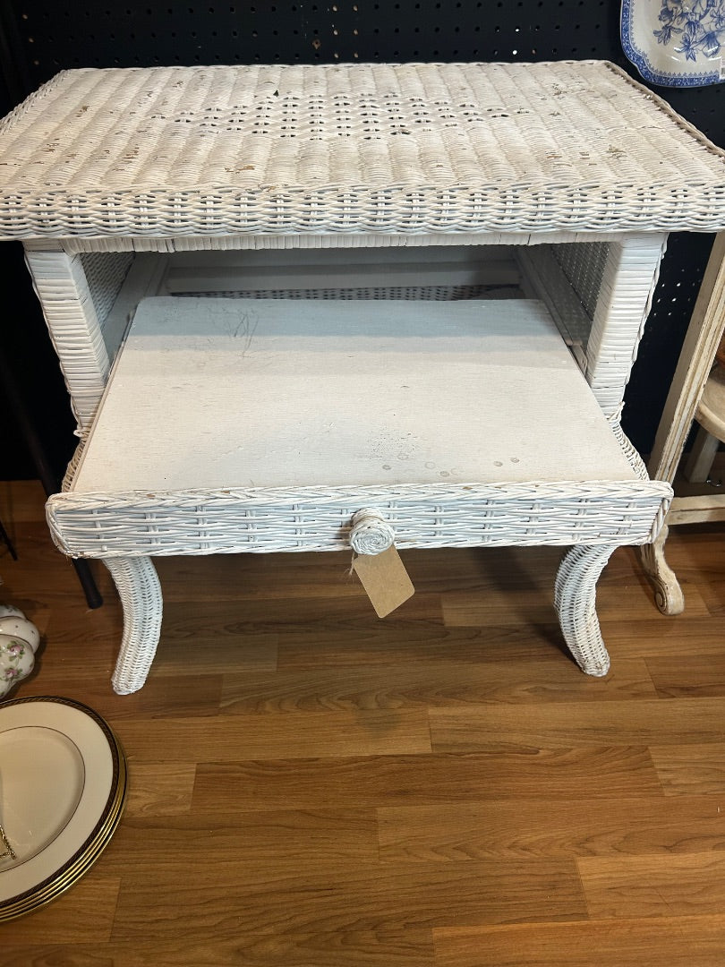 Vintage white wicker side table with shelf that pulls out.