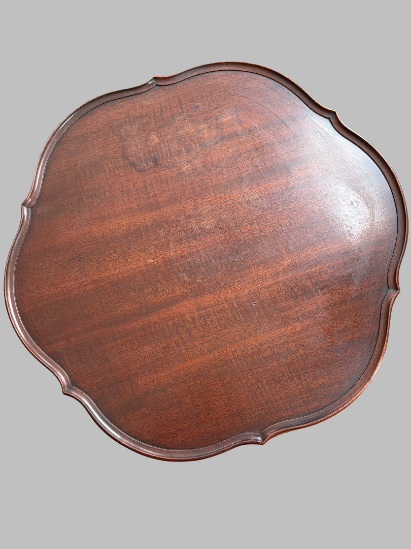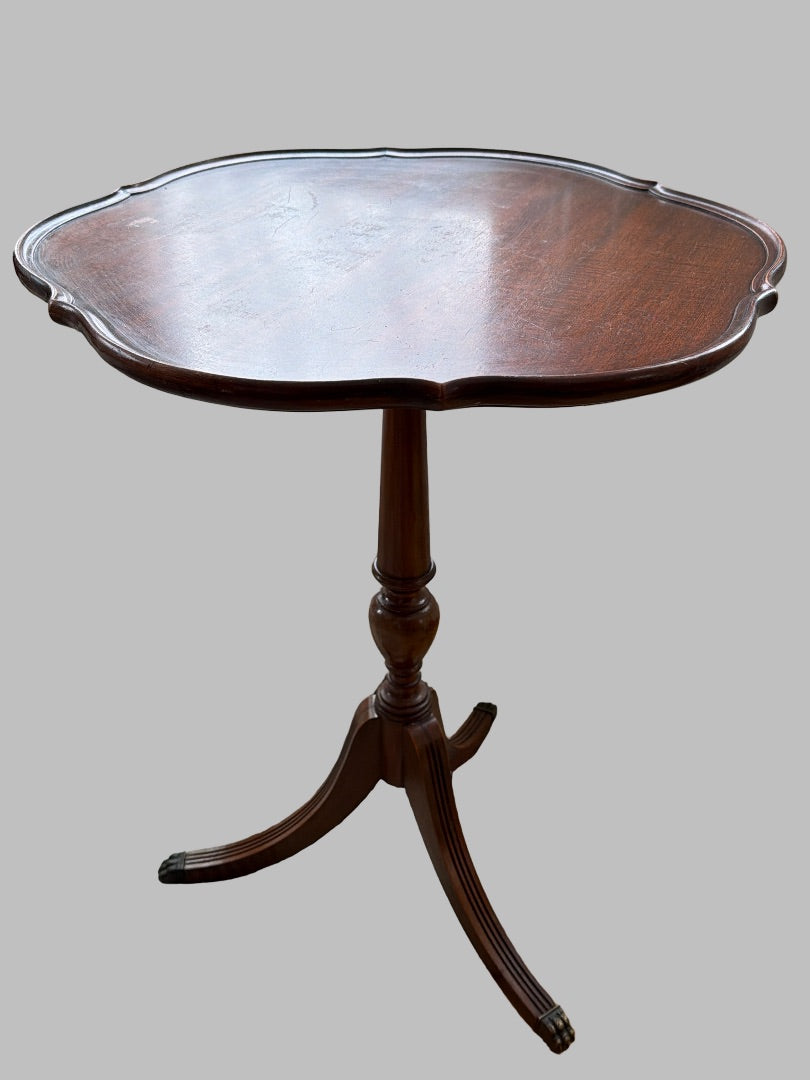 Elegant Imperial Furniture accent table with a scalloped mahogany top and classic pedestal base. Rich wood tones and graceful curves make this a timeless piece, perfect as a side table, entryway accent, or lamp table.