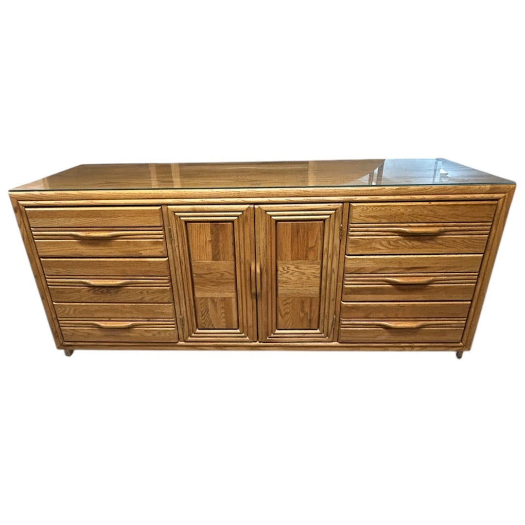Solid Oak 9 Drawer Dresser with Glass Top