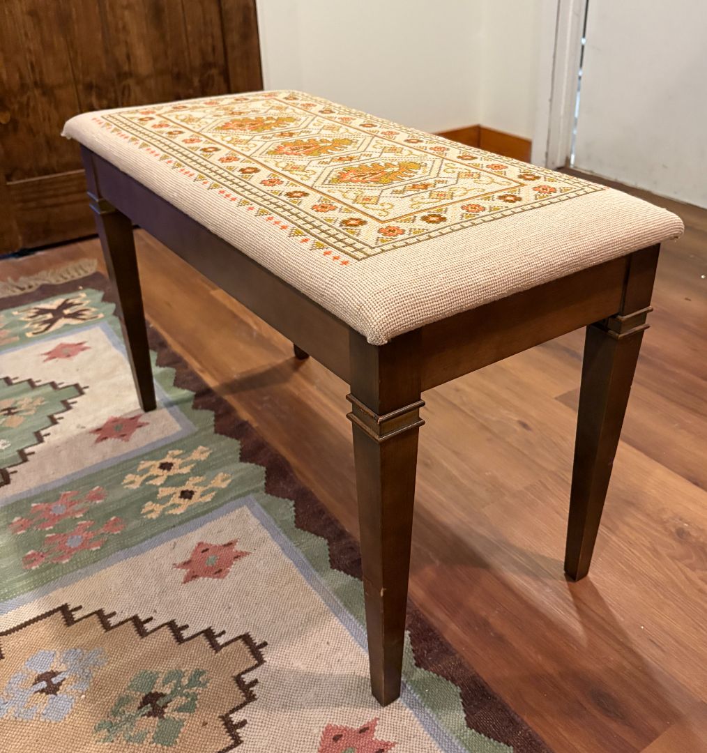 • Vintage wooden bench w/ needlepoint 30"x15w"X19.5"h. Piano bench with storage.