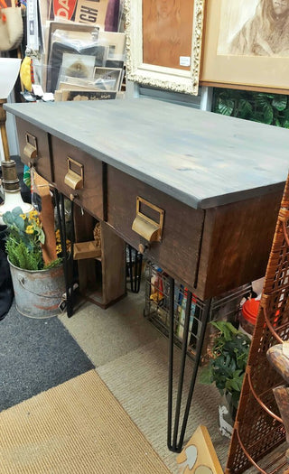 Custom 1940s Metal Drawer Cabinet Table Console Desk, with pin legs, Brass Pulls, wood top