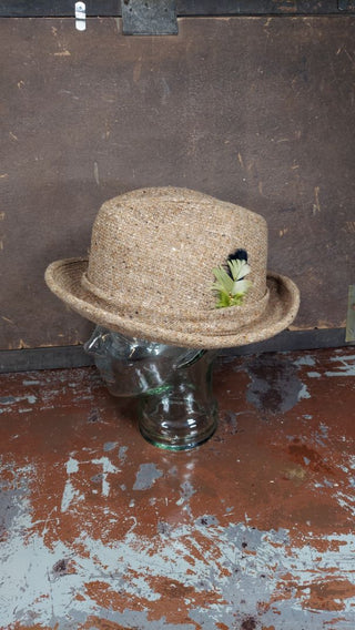 1970s Brown Cream Tweed Wool with decorative Feathers Trilby Fedora Hat by J.A. Miller Co. Made UNION USA, 2" brim (As-Is) with drop-down ear flap