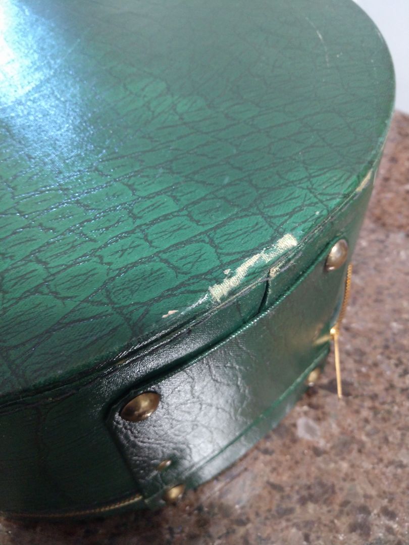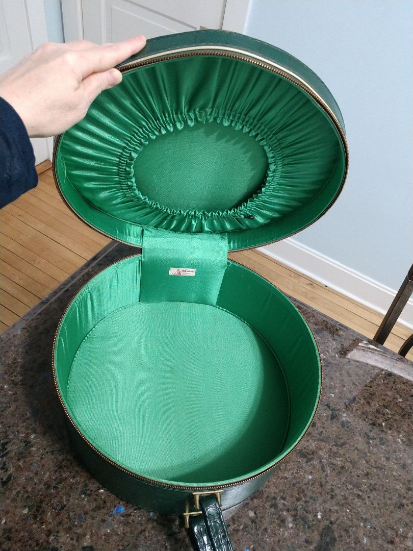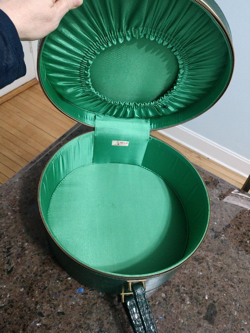 Vintage Green Tailored Light Luggage Round Hat Box Style Suitcase Zip USA Made by " Tote - About". This is vinyl covered cardboard. Very light weight. Zipper works Great! Minor wear and tear on the edges. No stains no odors , was always in the closet with hats! EXCELLENT Condition!!!! Hat Pin Included!
