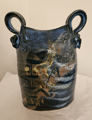 Blue Glazed Vase with Handles Signed by Flynn Sochon