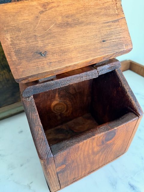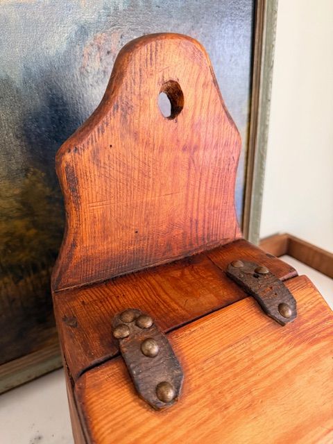 Antique Wall-Mounted Wooden Salt Box w/ Leather Hinged Lid