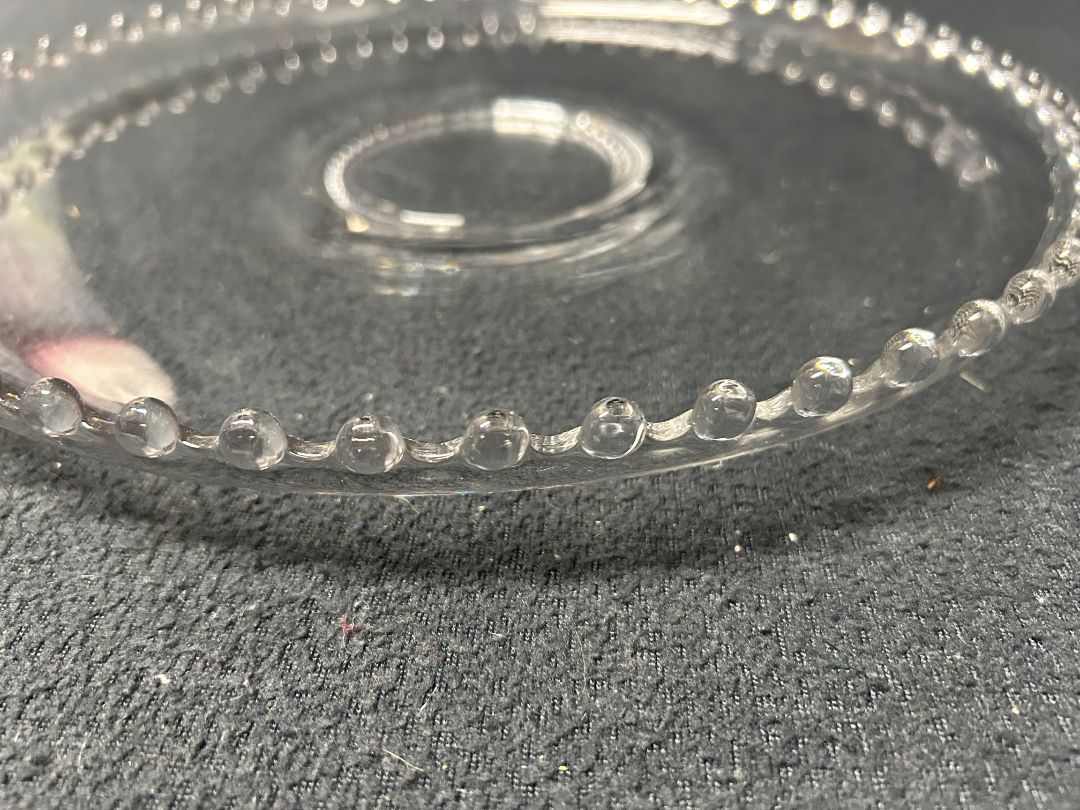 • Gently used with a beautiful beaded rim. It does have a slight chip underneath the middle section.