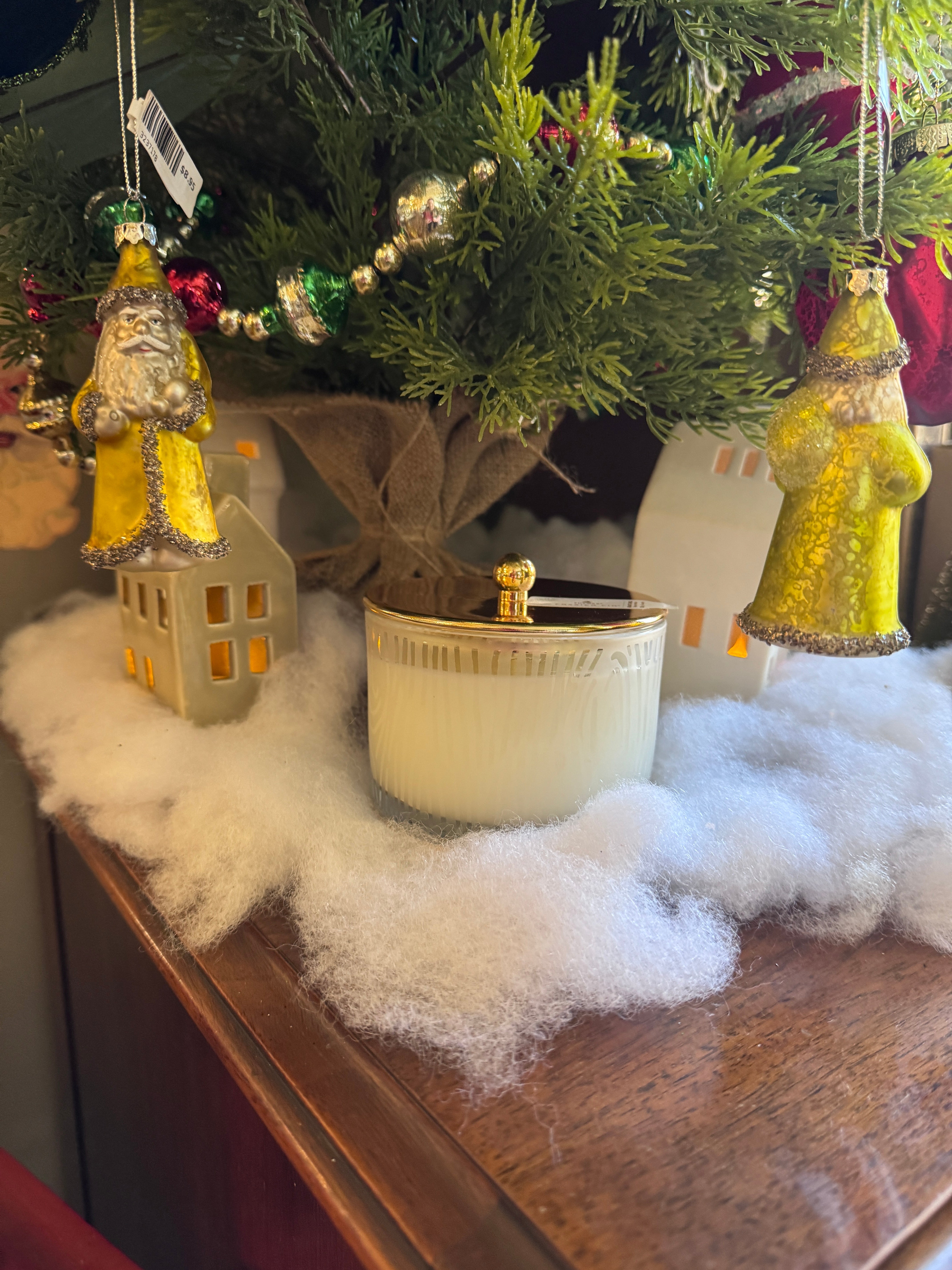 Accented with a glistening gold lid and gilded gold base, this elegant and luminous frosted wood grain candle is the perfect way to experience Frasier Fir.