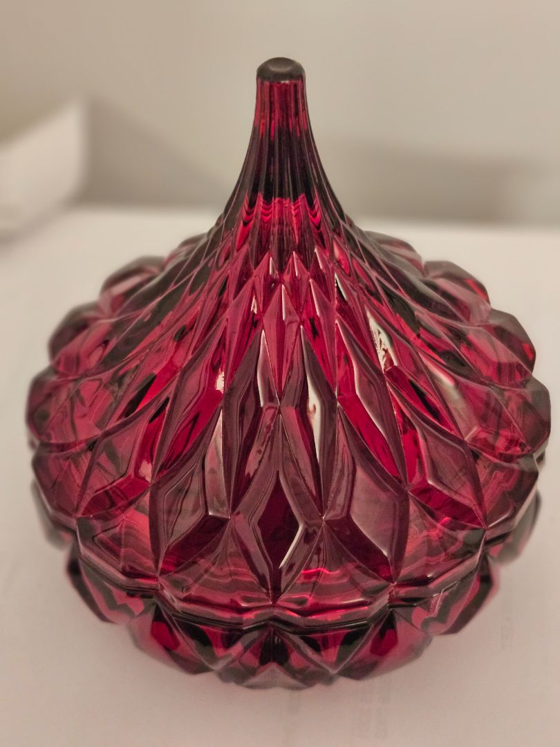 Brilliant red crystal covered candy dish, shaped like a Hershey's Kiss. By Godinger.