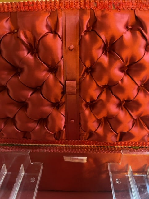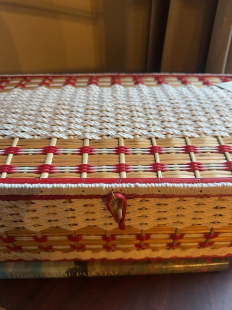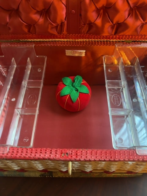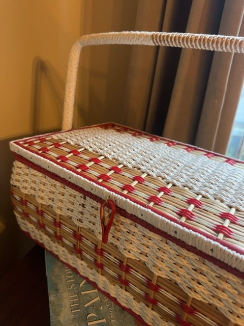 Vintage, wicker sewing basket with handle, satin fabric inside and compartment. Great condition