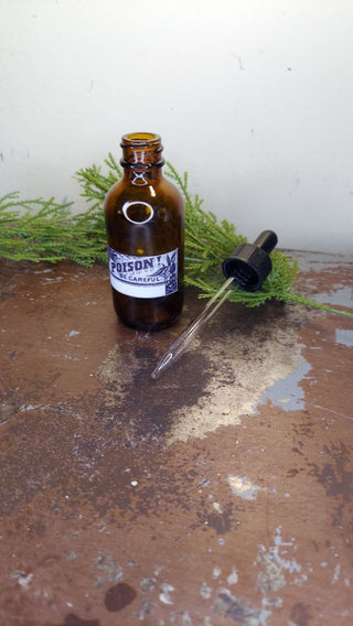 Poison labeled amber apothecary, glass dropper bottle. Halloween Medical decor.