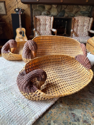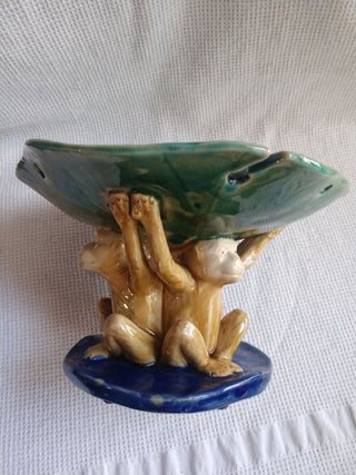 Vintage Whimsical Three Monkeys Holding Lily Pad Bowl Majolica Centerpiece