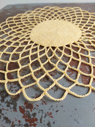 .01) Yellow Crochet Lace Sunburst Doily (Starched) hot pad / wall art