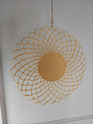 .02) Yellow Crochet Lace Sunburst Doily (Starched) hot pad / wall art