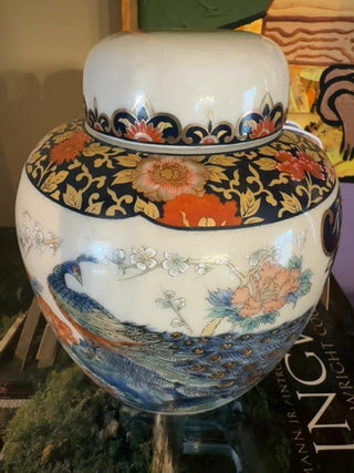 Vintage, Japanese peacock hand painted jar with lid