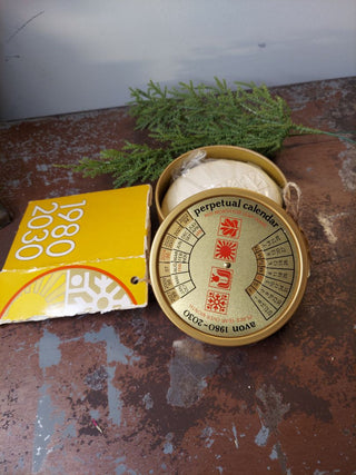 1980 Avon Perpetual Calendar Tin, with original new classic blend fragrance soap (T&M)