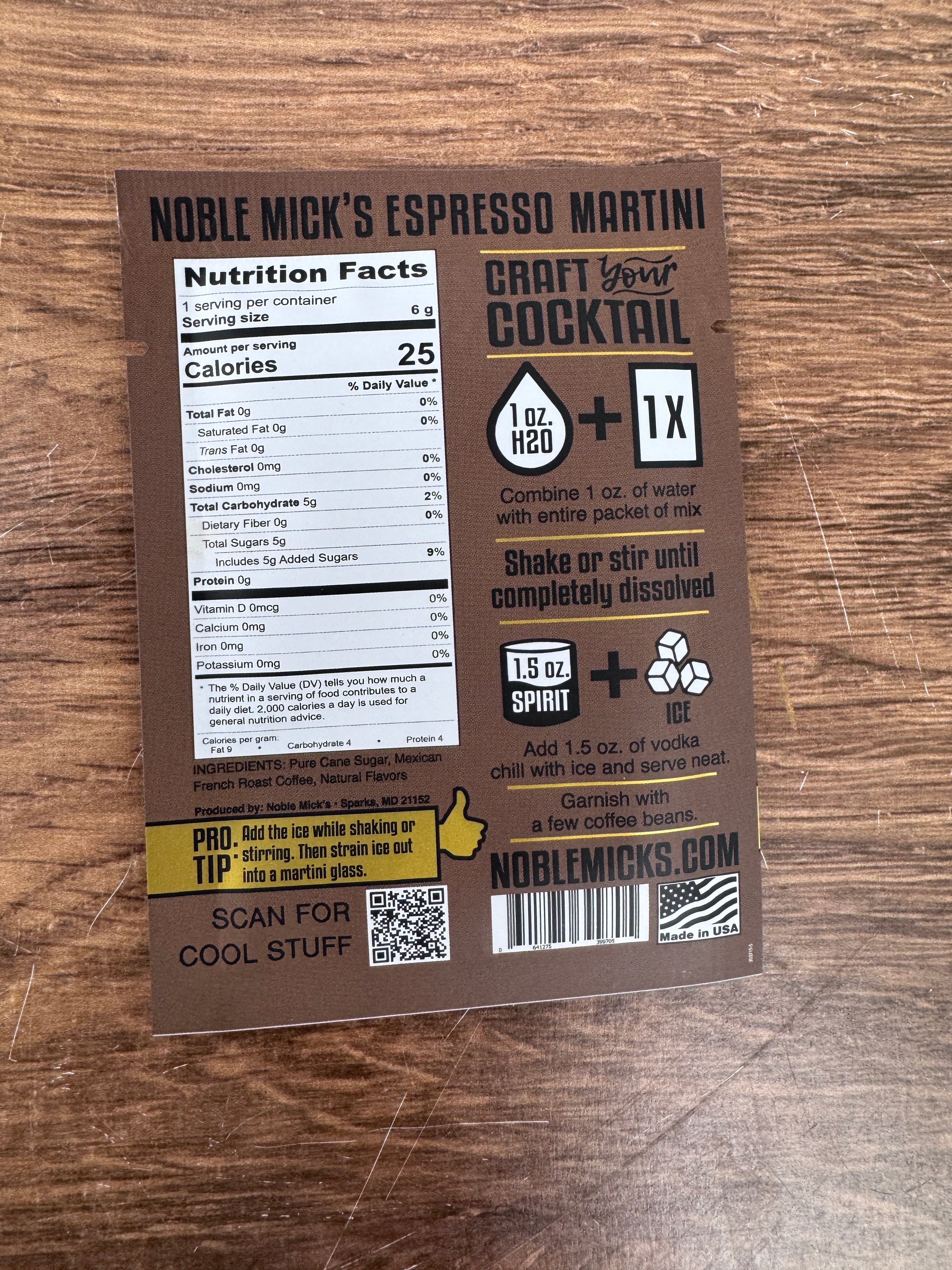 Made with all-natural fruit and vegetable powders, warm spices, and pure cane sugar, Noble Micks keeps it clean, never artificial, and never syrupy. Just add water and your favorite spirit (or skip the spirit for a mocktail), shake with ice, and sip your way into espresso heaven.