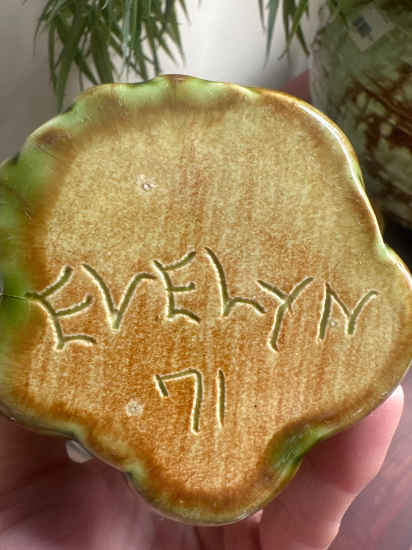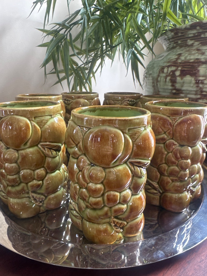 Vintage, Mcm art ceramic tumblers /vase fruit details grape, apple, pear,peach. Hand made & signed 1971