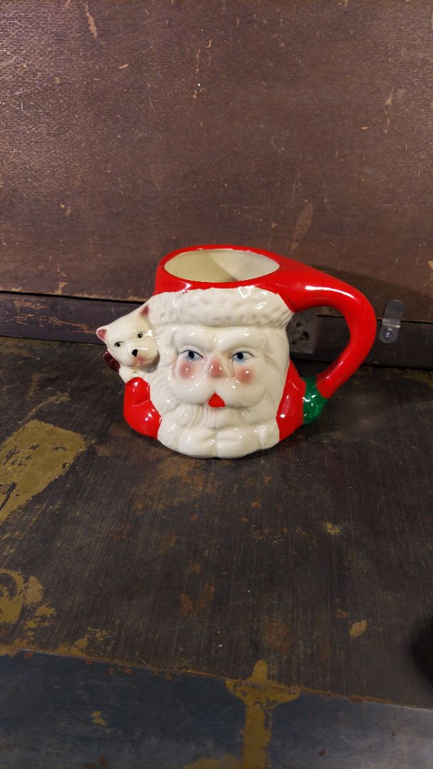 Absolutely adorable with red cheeks Santa Claus mug with a white catch or terrier puppy on his shoulder dressed with a bow.